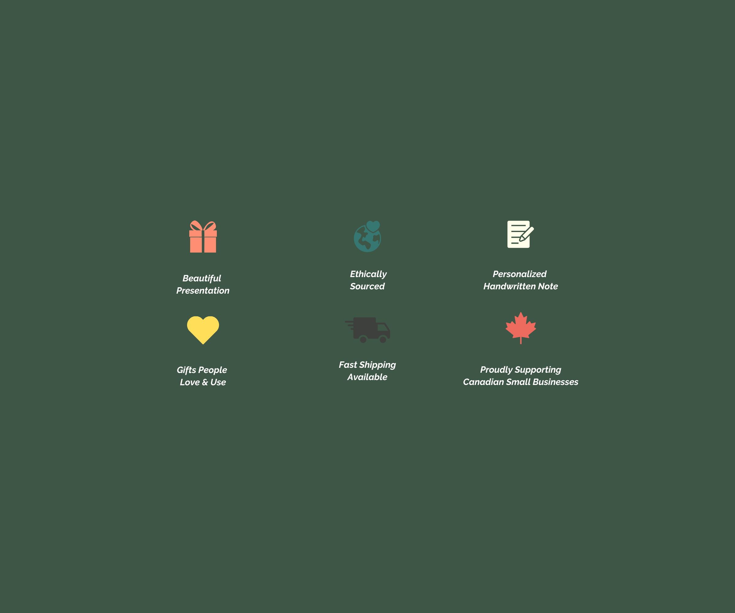We carefully source our products from Canadian small businesses (like ours) to ensure that our gifts contain the highest quality items. We also make it our job to taste, try and use all the items you'll find in our gifts to make sure they pass our high standards. After all, we wouldn't want to give a gift something we wouldn't like and we know you don't either!