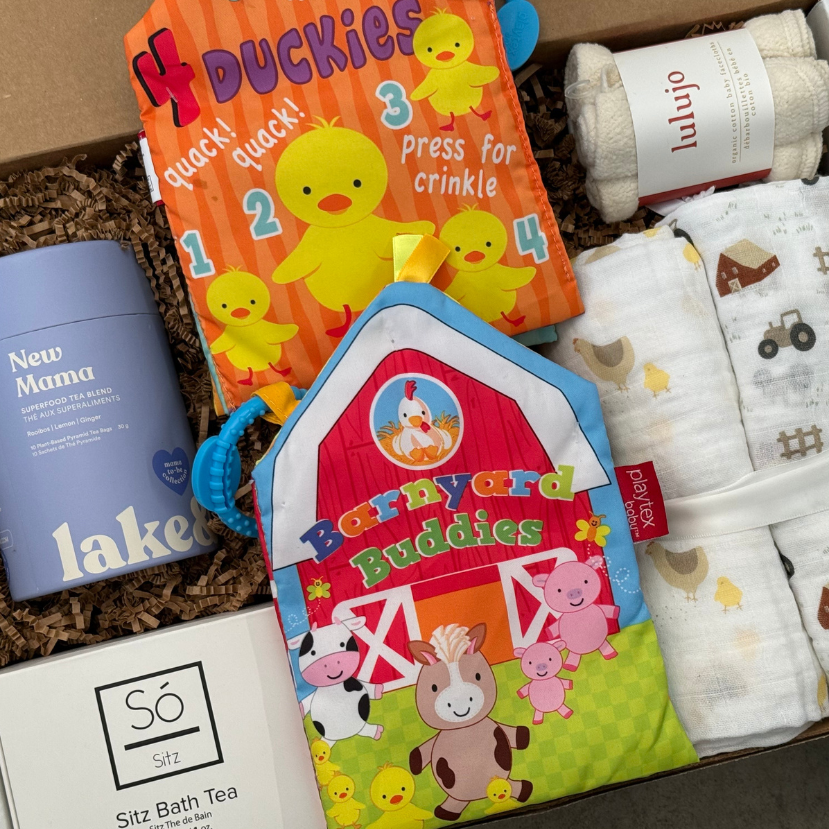 Our baby gift boxes are brimming with cozy blankets, playful teethers, gentle skincare products, and soft plushie toys – everything to comfort and entertain the little one. We also include thoughtful items for mom and dad, like soothing mama body oils or delicious treats to help them navigate those precious (and sometimes sleep-deprived) first few weeks.