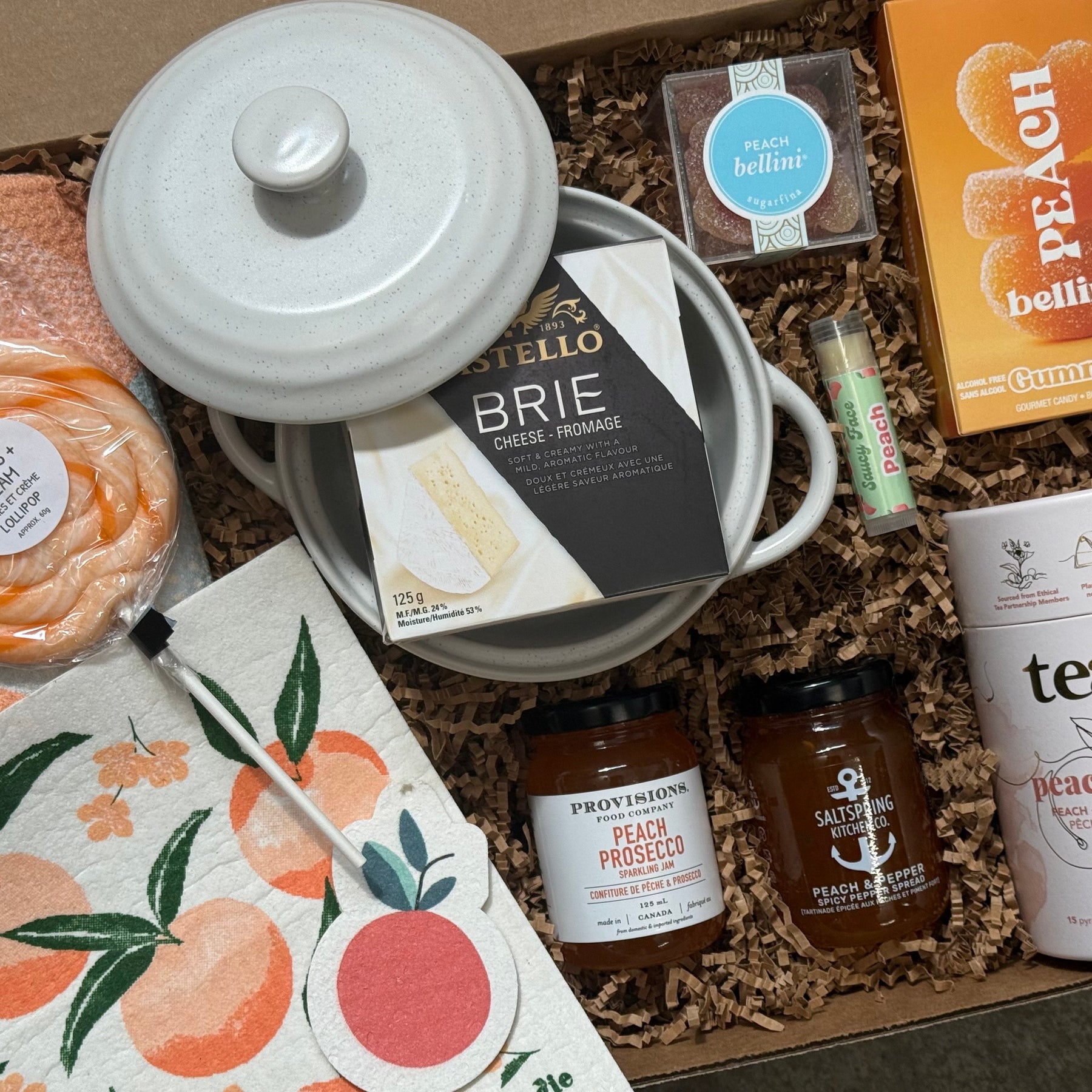 Gift box with assorted items including a jar of brie, peach bellini gummies, and tea.