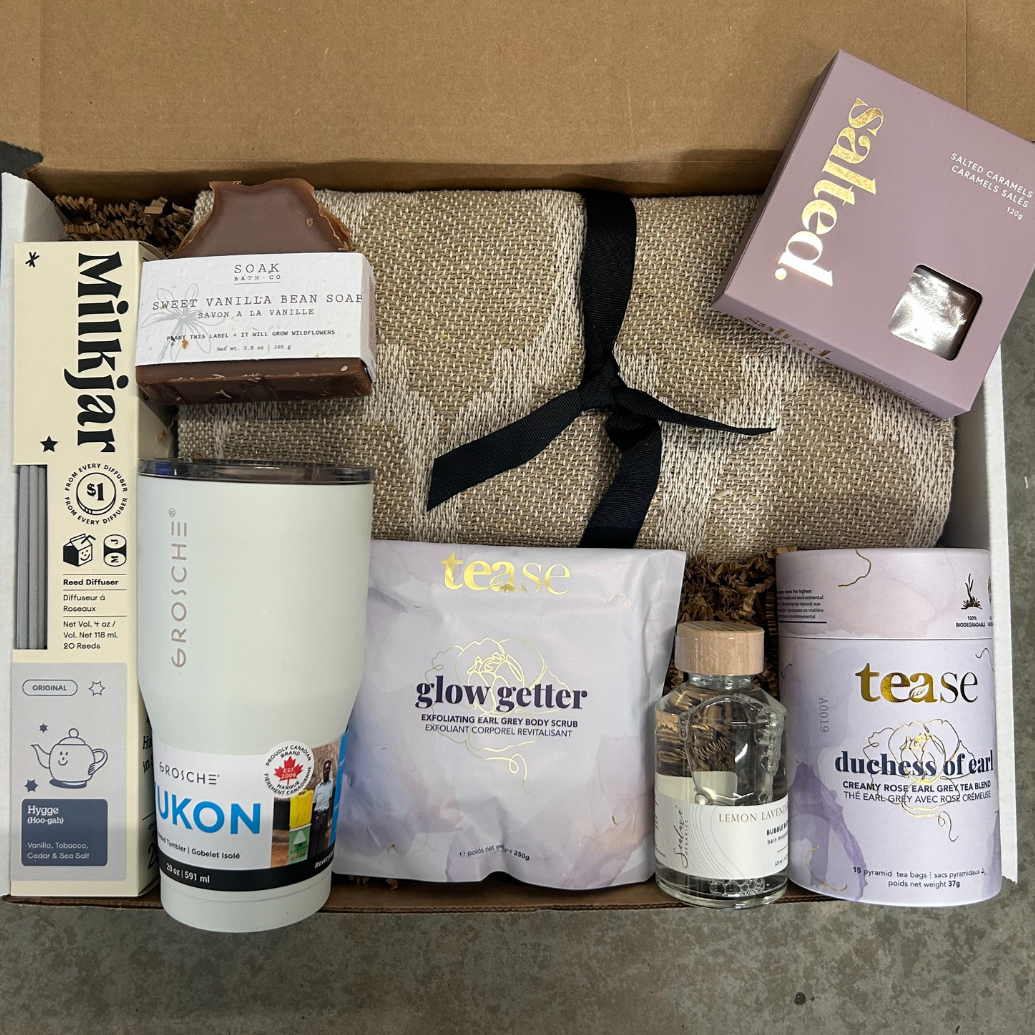 A NOTE ABOUT SUBSTITUTIONS: We partner with small Canadian businesses to bring you a unique selection of products in our gift boxes. While we strive to include every item pictured, sometimes unforeseen circumstances can impact availability.  To ensure you receive a beautiful and complete gift, we reserve the right to substitute an unavailable item with a comparable product of equal or greater value.