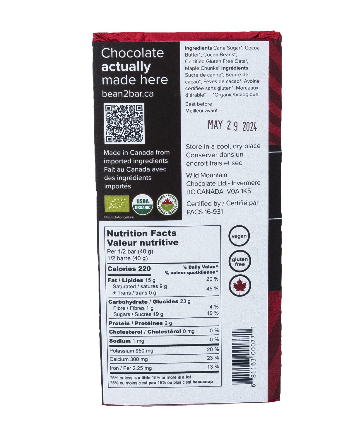 Certified Organic (PACS 16-931) and gluten-free, this 80g bar is made with: